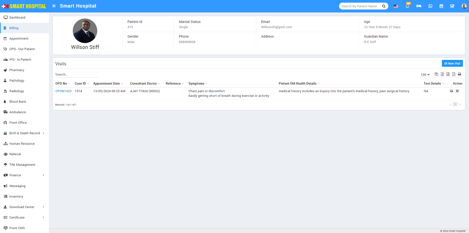 To add New Visit for patient click on New Visit button present at top right corner, here enter details and click on Save & Print or Save button.