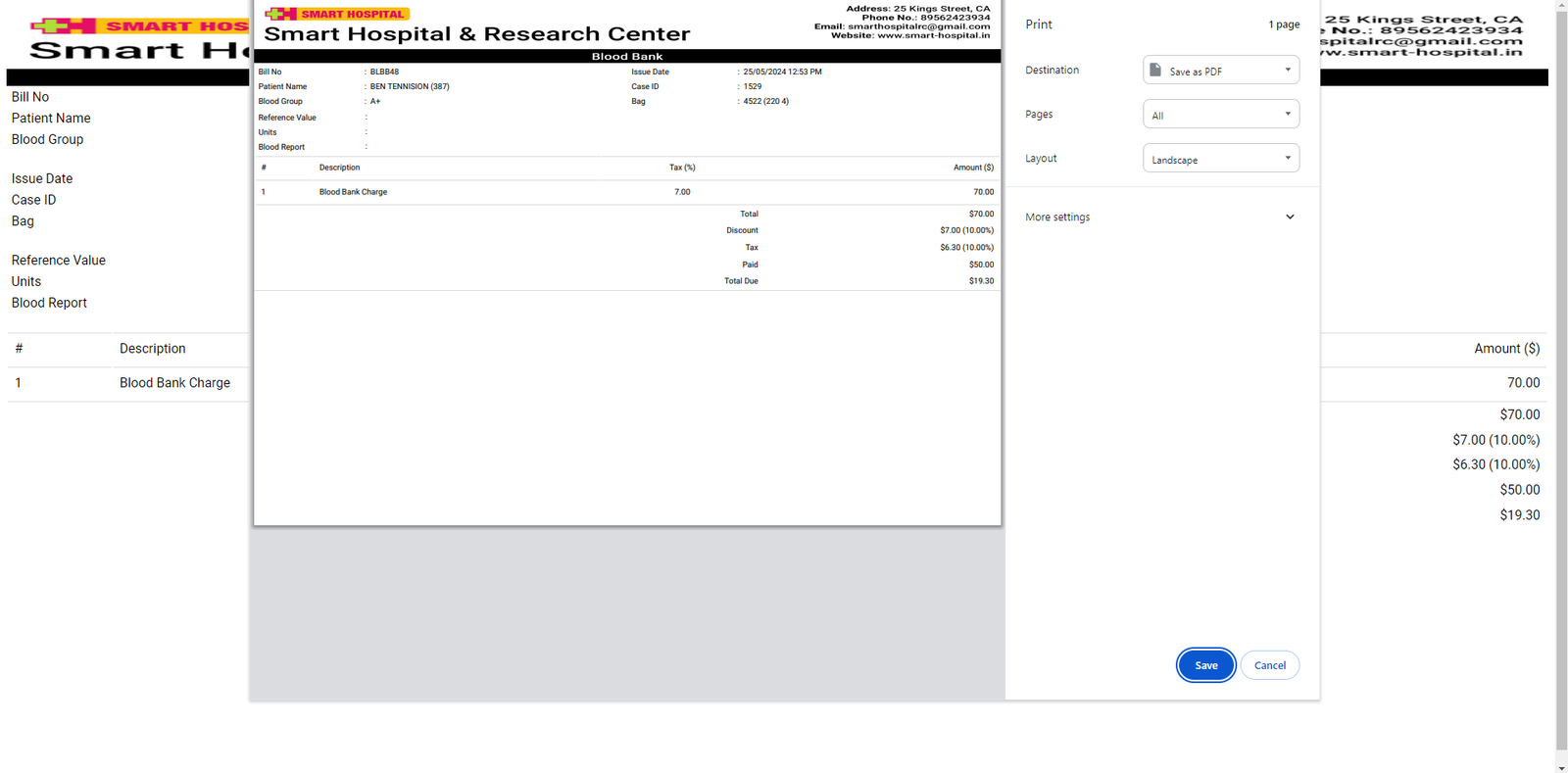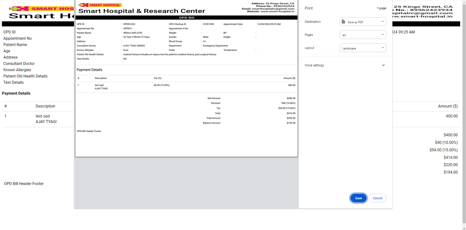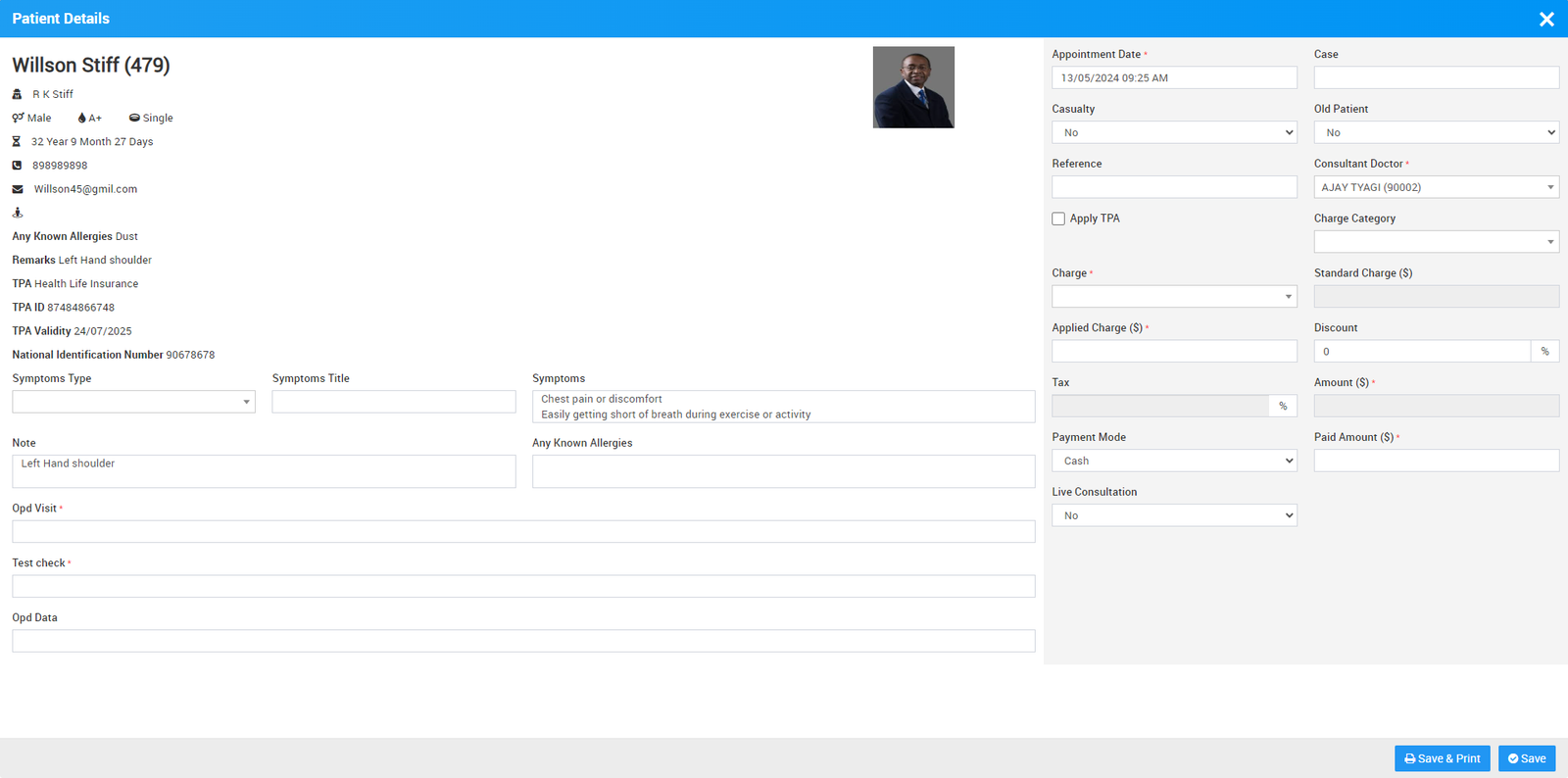 You can also create a new OPD patient and then print the patient’s OPD bill. To do this, click on the + Add Patient button. Enter the patient's information from the search field or by adding a new patient using the + New Patient option. Then, enter the remaining details and click on the Save & Print or Save button