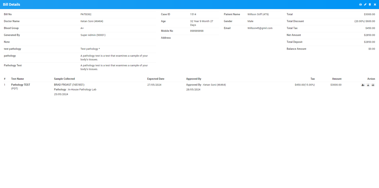 You can edit and delete patient's pathology billing details, by clicking on Edit and Delete icon present on the to right corner of the modal.