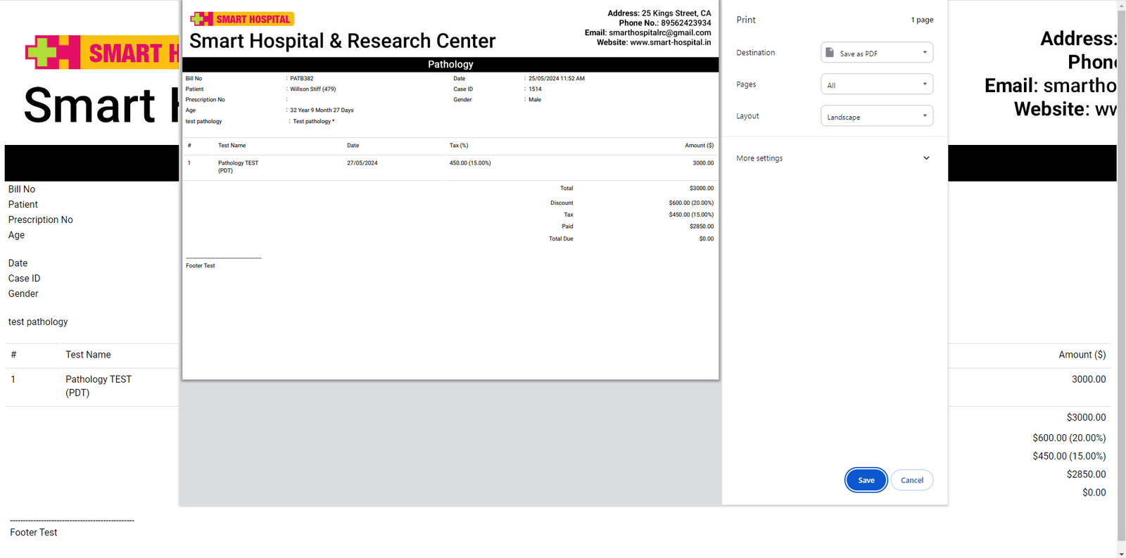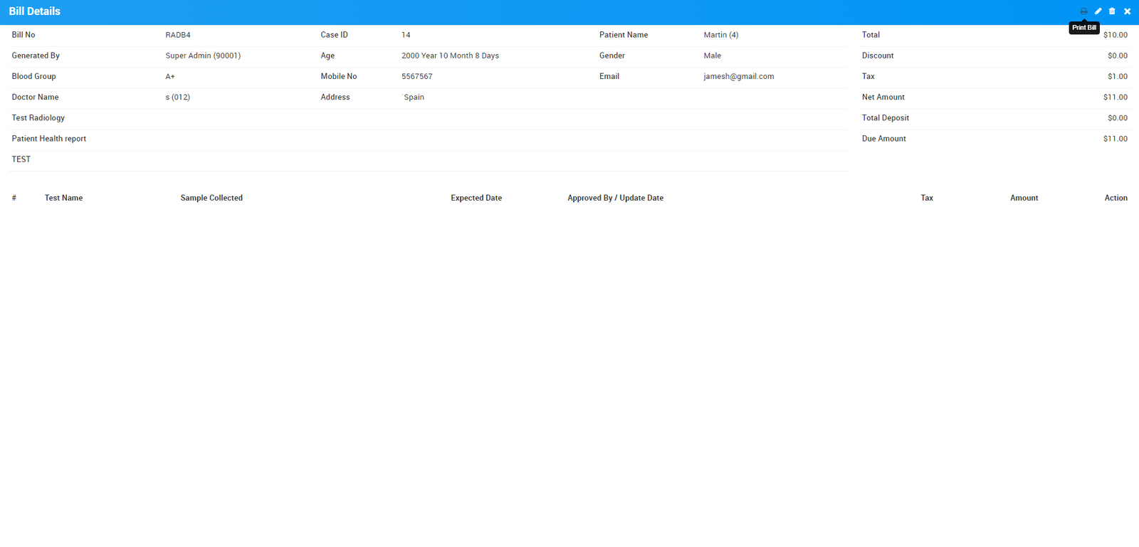 Now click on Print Bill icon located at top right corner, this will print all tests bill in a single bill.