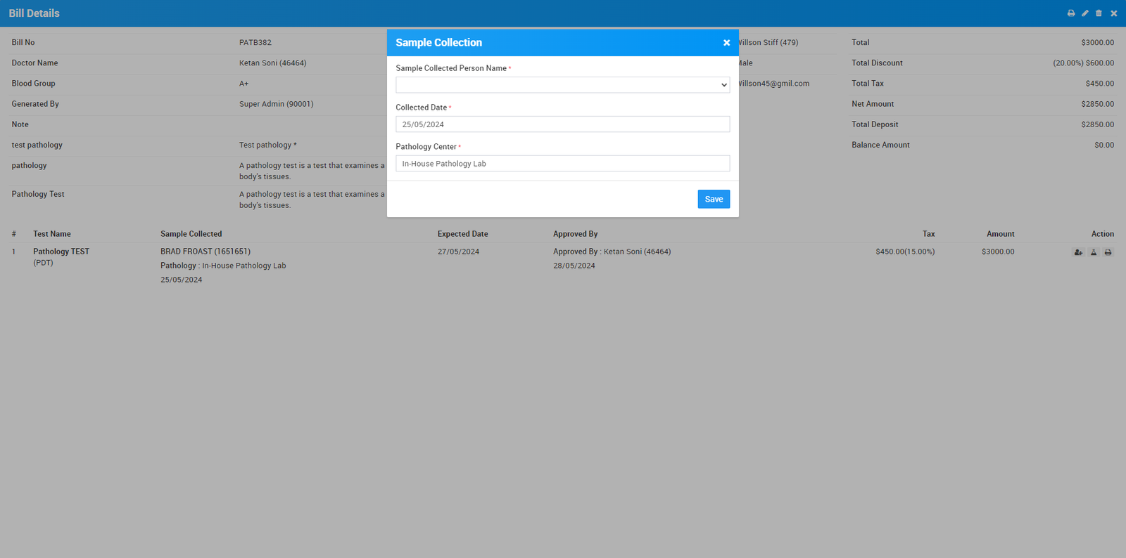 Once patient is added in pathology billing list, you can add sample collected person for the particular test. For this click on the Show icon present in the pathology billing record list and then click on the notch icon present in Action column and then fill Sample Collected Person Name, Collected Date and Pathology Center and then finally click on the Save button.