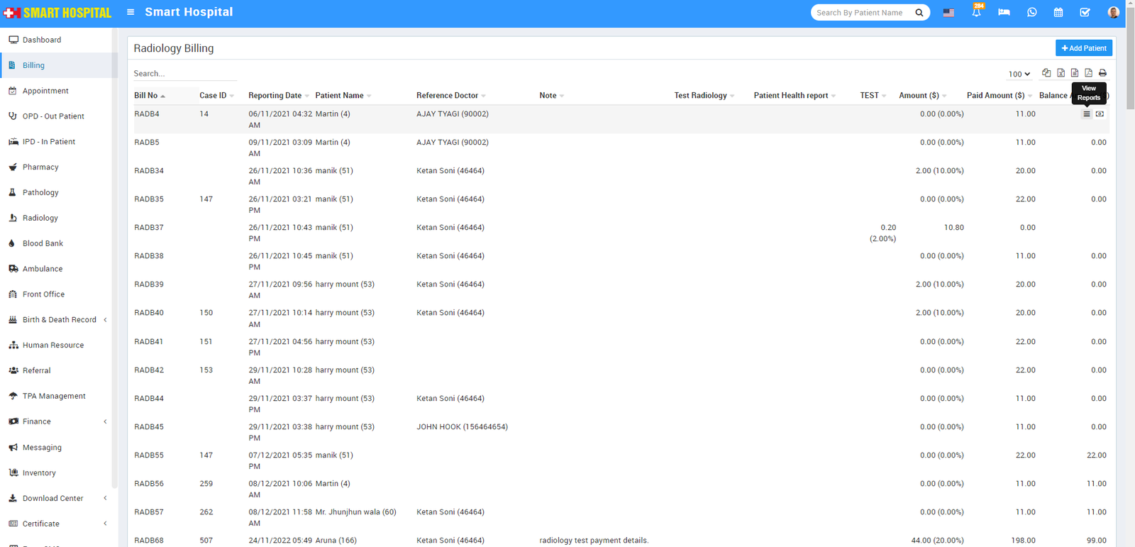 To generate patient Radiology bill go to Billing > Radiology. Here you can see all patient radiology reports so to generate or print radiology test bill for previously created radiology patient records click on View Reports button available at last column on mouseover.