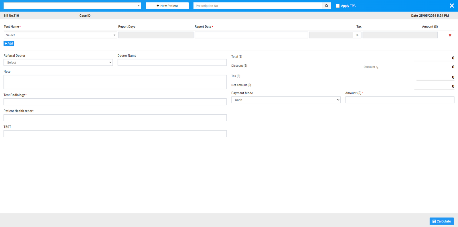 To create new patient radiology bill first create new radiology test record for this click on + Add Patient button here enter Patient (patient can be added here in three ways 1. Search for patient at search area. 2. Add new patient through +New Patient and 3. Enter Prescription No, 4. check the checkbox of Apply TPA (Third Party Administrator). so patient details with prescribed test will auto fill at generate bill), Test Name, Reports Days, Report Date, Tax, Amount, Hospital Doctor and Doctor Name, custom field details (if any) then after adding all radiology test details enter Discount and Tax if any to calculate final bill click on Calculate button then click on Save button. After this, bill will be display on Radiology bill page.
