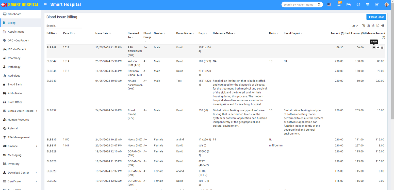 To generate patient Blood Issue bill go to Billing > Blood Issue. Here you can see all patient blood issue record.