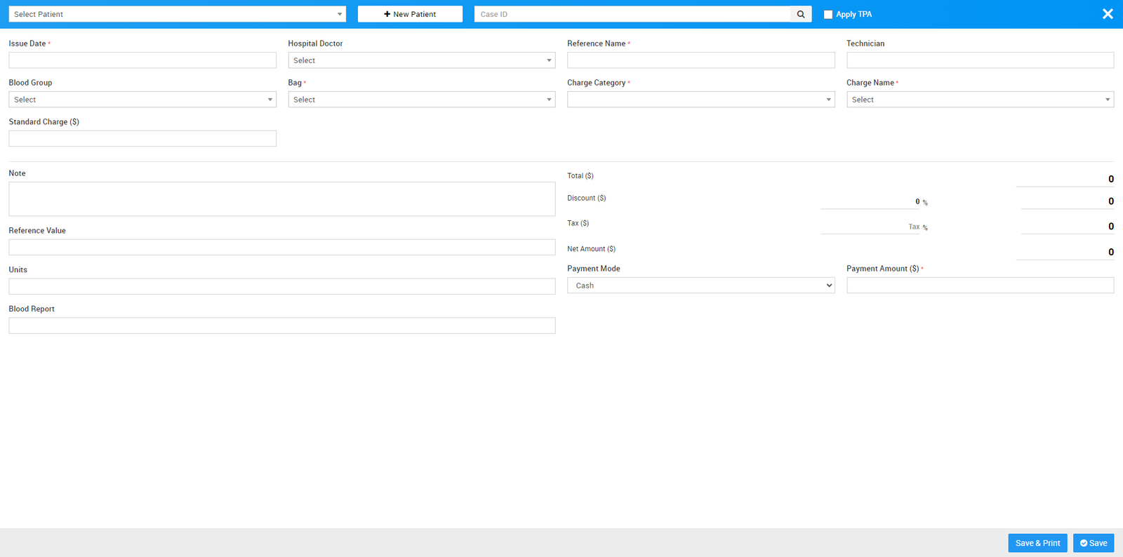 To create patient new Blood Issue bill first create new Blood Issue record for this click on + Issue Blood button here enter Patient from Select Patient (search for available patient) or create new patient from + New Patient Button or add patient by entering Case ID (you can find Case Id from OPD or IPD detail of Patient), and check the check box of Apply TPA (Third Party Administrator) now enter Issue Date, Hospital Doctor, Reference Name, Technician, Blood Group, Components, Bag, Charge Category, Charge Name, Standard Charge, Note, Discount, Tax, Payment Mode and Payment Amount (Payment Amount will automatically calculate) then click on Save & Print or Save button. After this bill will be display on issue Blood bill page.