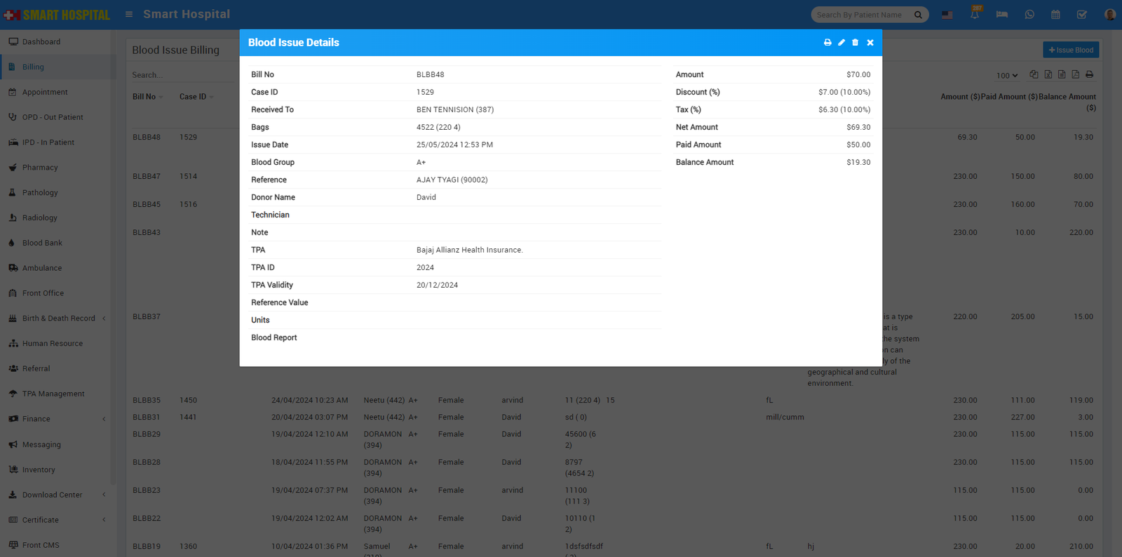 To create patient new Blood Issue bill first create new Blood Issue record for this click on + Issue Blood button here enter Patient from Select Patient (search for available patient) or create new patient from + New Patient Button or add patient by entering Case ID (you can find Case Id from OPD or IPD detail of Patient), and check the check box of Apply TPA(Third Party Administrator), now enter Issue Date, Hospital Doctor, Reference Name, Technician, Blood Group, Bag, Charge Category, Charge Name, Standard Charge, Note, Discount, Tax, Payment Mode and Payment Amount (Payment Amount will automatically calculate) then click on Save & Print or Save button. After this bill will be display on issue Blood bill page.