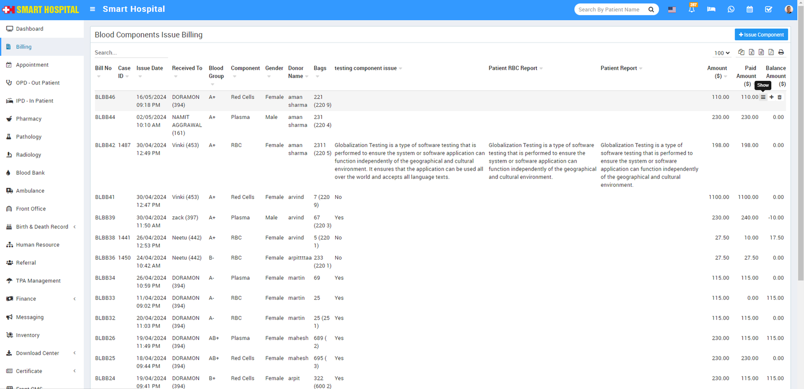 To generate or print a Blood Component Issue bill for previously created records, click the Show button in the last column when you hover the mouse over it