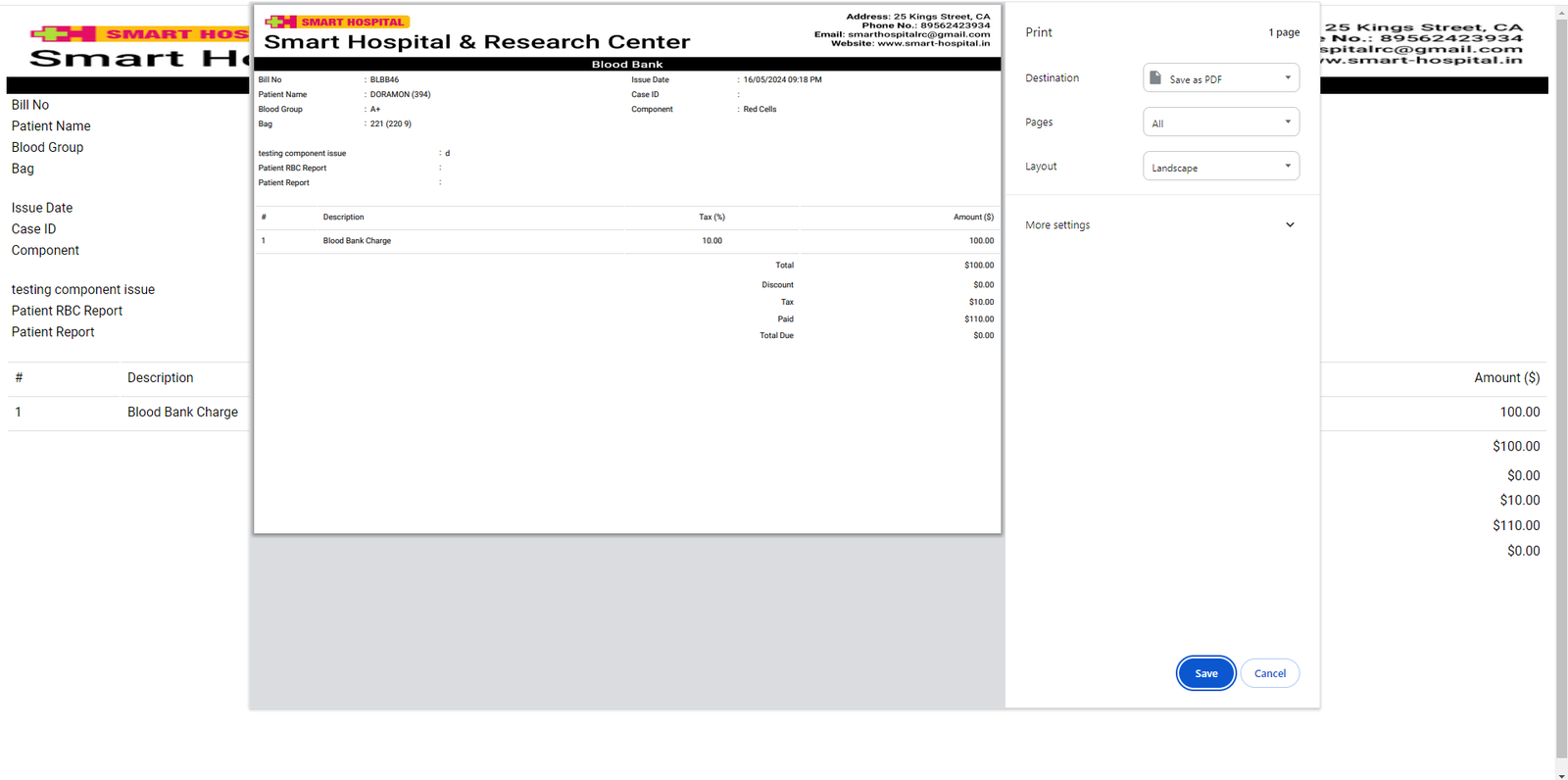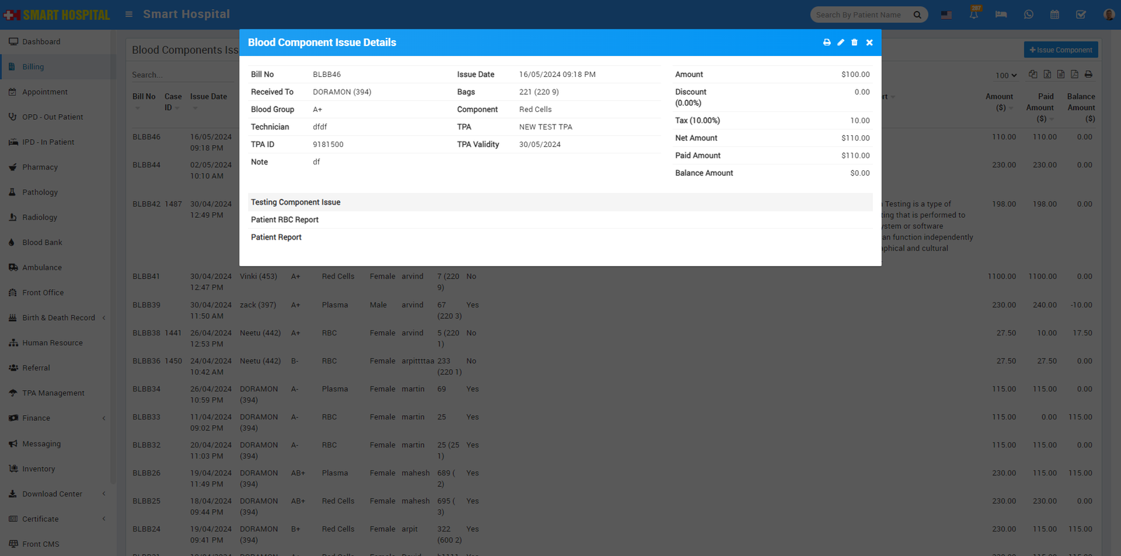 To generate patient Blood component Issue bill go to Billing > Blood Component Issue. Here you can see all patient blood issue records