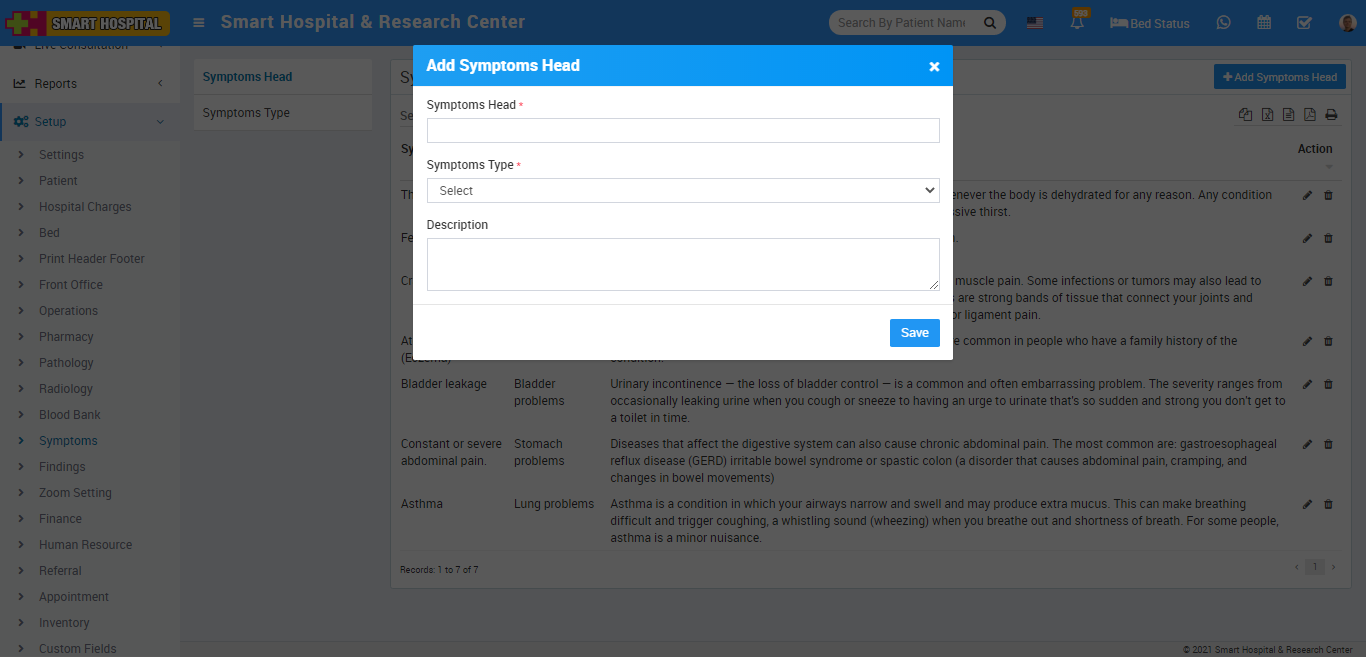 To add Symptoms Head click on + Add Symptoms Head button now enter Symptoms Head Symptoms Type, Description and click on Save button.