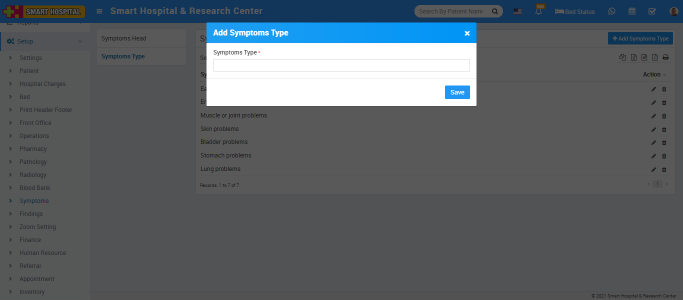 To add Symptoms Type click on + Add Symptoms Type button now enter Symptoms Type and click on Save button.