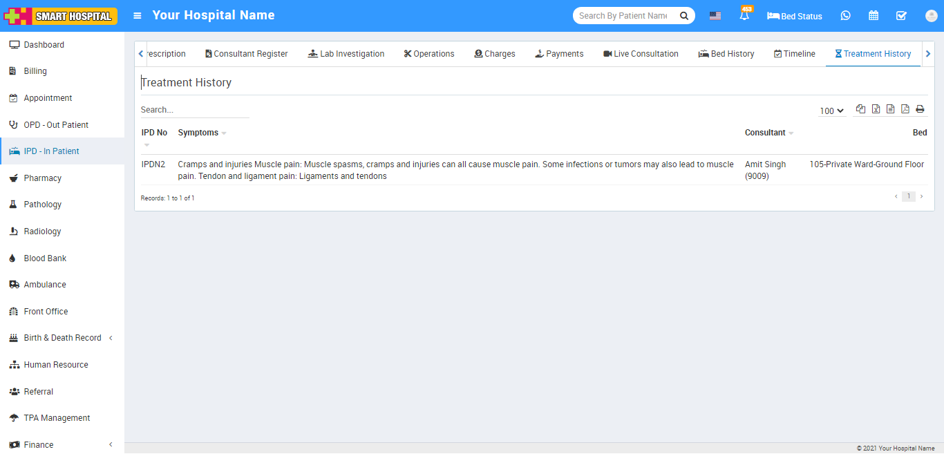 Here you can also check checkup details, charges, medication, operations etc by click on IPD no.