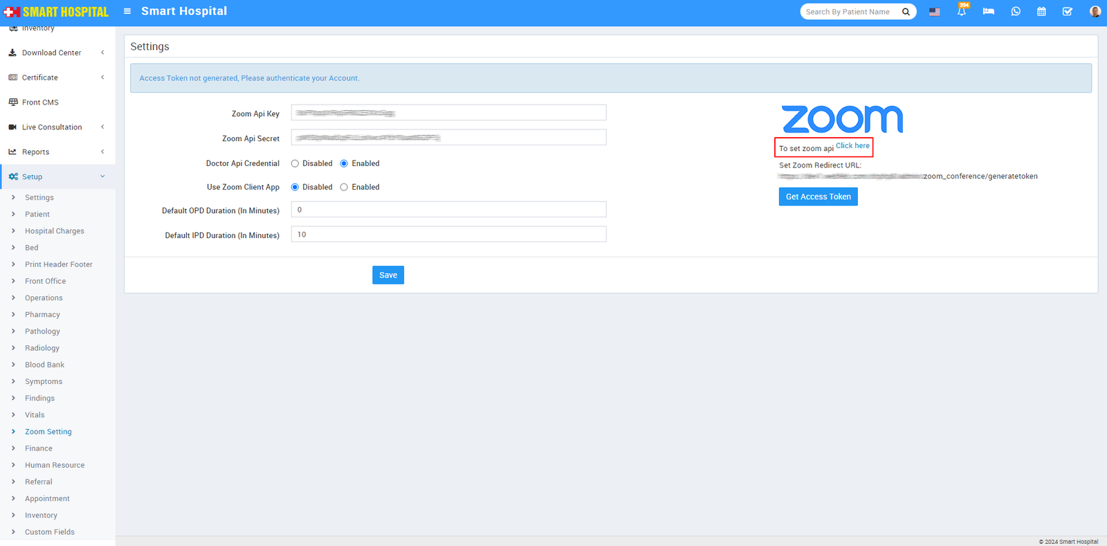 To configure Zoom Live Consultation, go to Setup > Zoom Setting, On the right side setting page will be open.