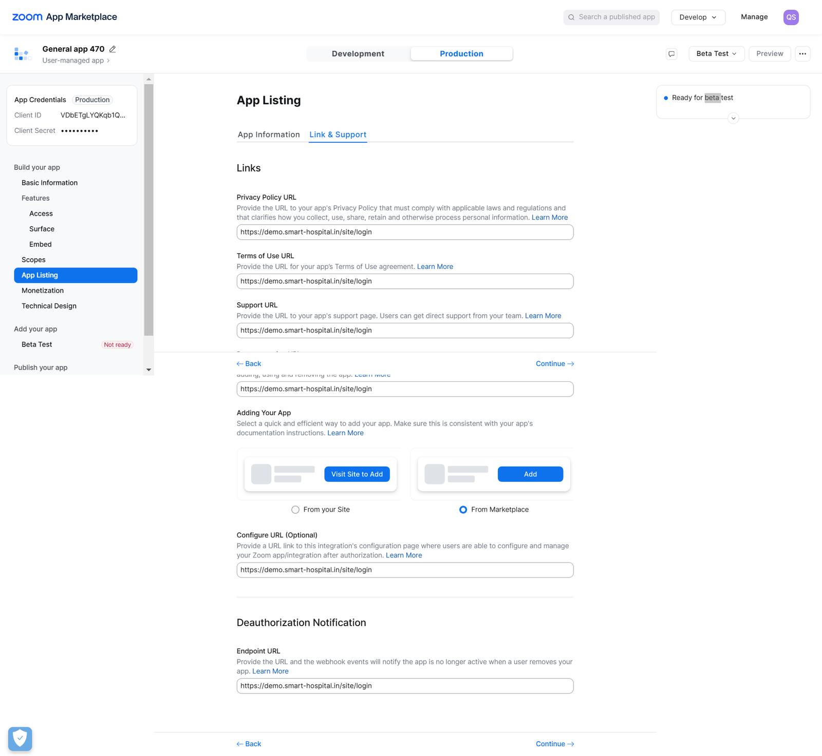 now click on Continue button Beta Test page will be open from here you can regenerate the Authorization URL if you made any changes in previous settings.